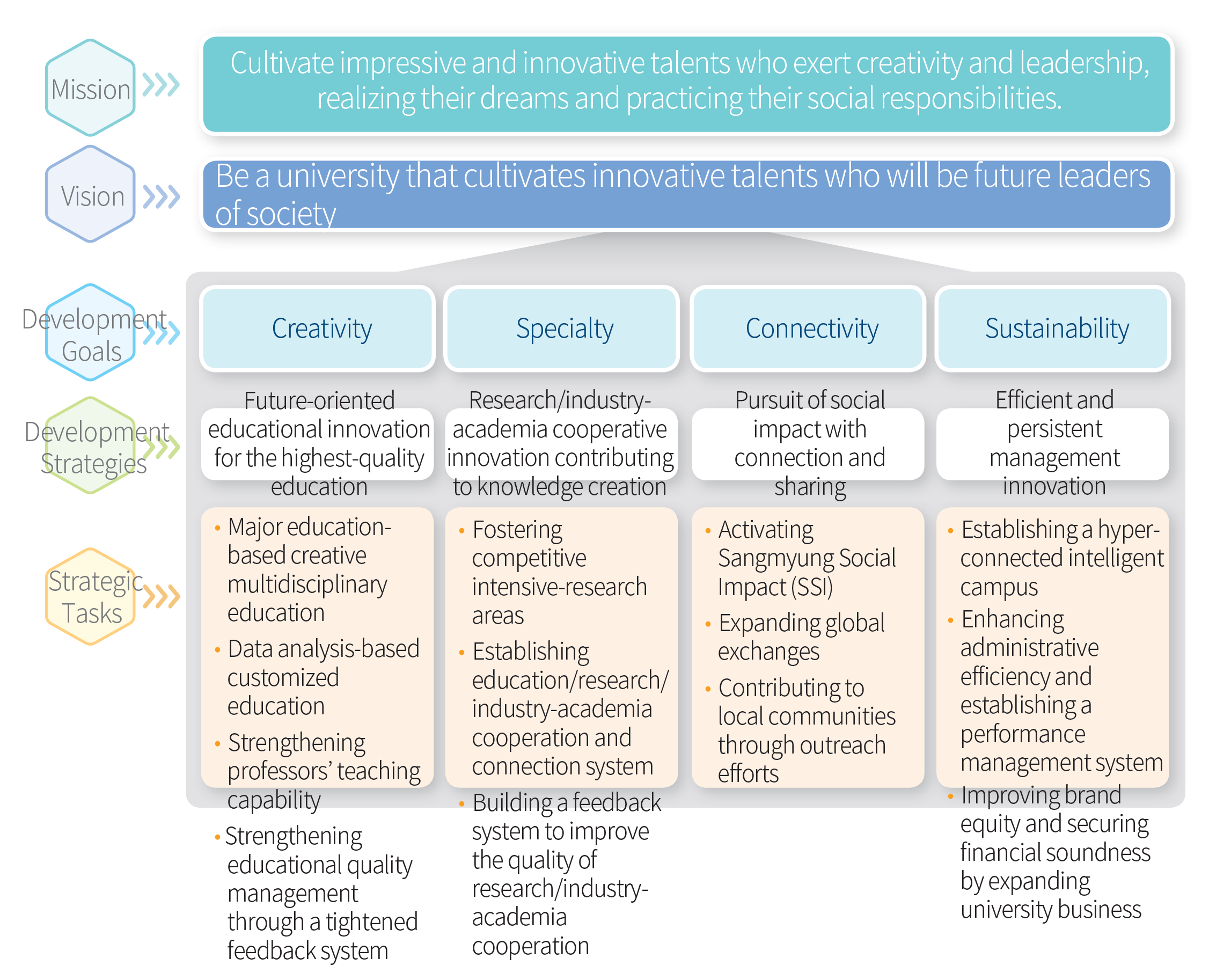 Mission => Cultivate impressive and innovative talents who exert creativity and leadership, realizing their dreams and practicing their social responsibilities. Vision = > Be a university that cultivates innovative talents who will be future leaders of society Development Goals =>Creativity, Specialty, Connectivity, Sustainability Development Strategies =>Through • Future-oriented educational innovation for the highest-quality education • Research/industry-academia cooperative innovation contributing to knowledge creation • Pursuit of social impact with connection and sharing • Efficient and persistent management innovation Strategic Tasks =>• Major education-based creative multidisciplinary education • Data analysis-based customized education • Strengthening professors’ teaching capability • Strengthening educational quality management through a tightened feedback system • Fostering competitive intensive-research areas • Establishing education/research/industry-academia cooperation and connection system • Building a feedback system to improve the quality of research/industry-academia cooperation • Activating Sangmyung Social Impact (SSI) • Expanding global exchanges • Contributing to local communities through outreach efforts • Establishing a hyper-connected intelligent campus • Enhancing administrative efficiency and establishing a performance management system • Improving brand equity and securing financial soundness by expanding university business