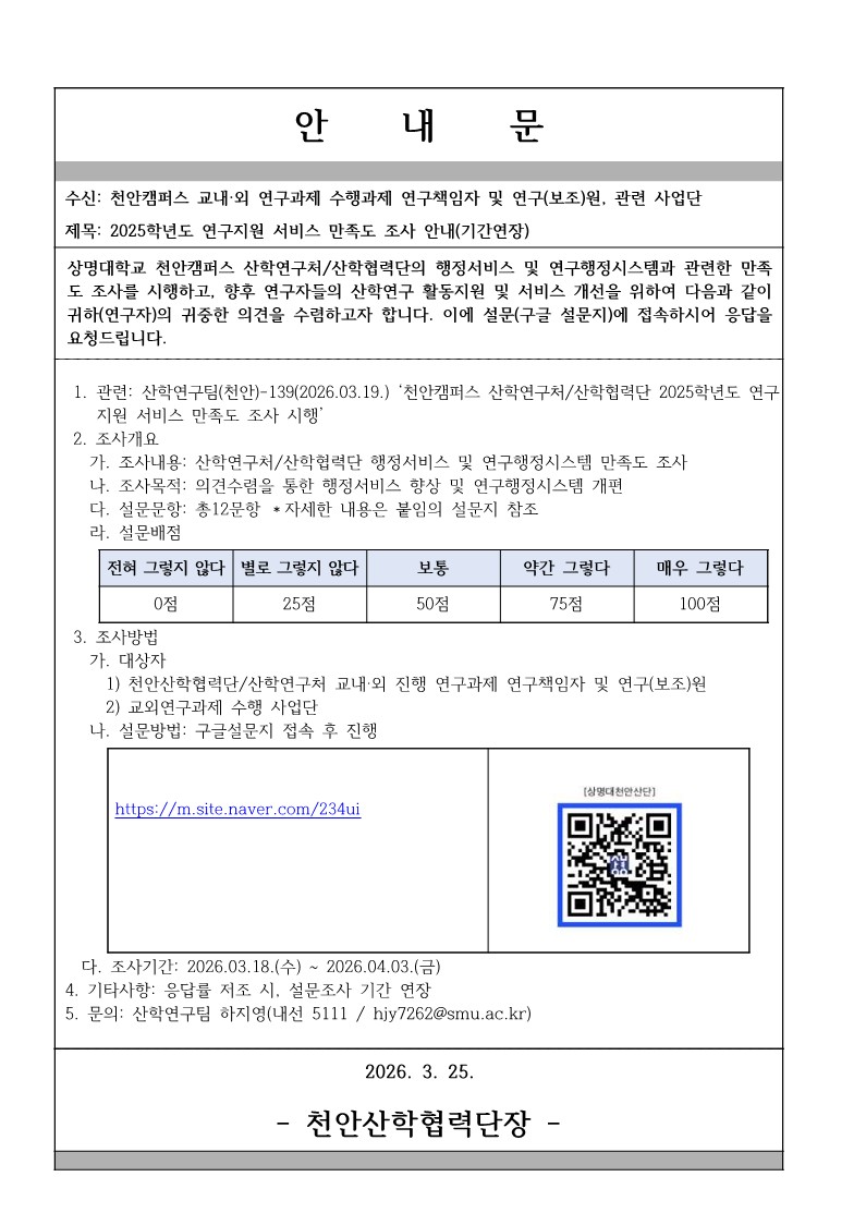 - [천안산학연구처/산학협력단] 2025학년도 연구지원 서비스 만족도 조사 시행 안내(기간연장)